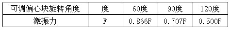 振動(dòng)電機(jī)每端出軸均有一個(gè)固定偏心塊和一個(gè)可調(diào)偏心塊,調(diào)節(jié)可調(diào)偏心塊和固定偏心塊之間的夾角可改變激振力的大小。出廠(chǎng)時(shí)可調(diào)偏心塊和固定偏心塊之間的夾角為0度,這時(shí)的激振力為振動(dòng)電機(jī)的額定激振力F,不同夾角時(shí)的激振力如表: